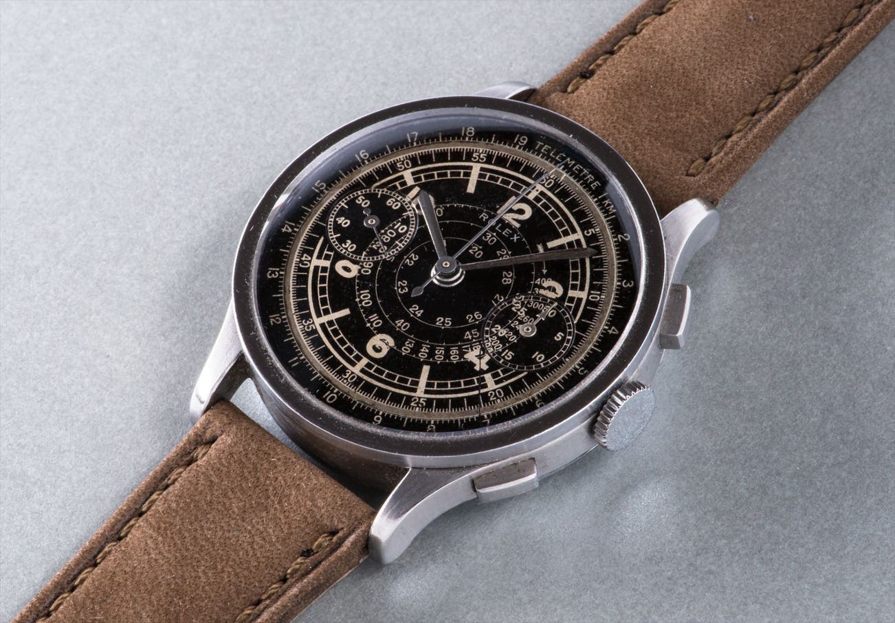 This exemplary model features a rare and stunning black dial featuring lustrous silver print – a highly uncommon dial with few examples appearing at auction. Having aged beautifully, the tachymeter and telemeter scales remain clear and legible. The telemeter scale stands out for legibility by a shiny silver ring that is the same width as the Arabic and baton indexes. The result is a superbly balanced dial design with exceptional readability. The snail-shape tachymeter scale adds further character to the dial. The rarity of the present watch is further enhanced by its superb condition. The case is sharp, with crisp lines, edges and intact finished surfaces as it left the factory seven decades ago. The serial number on the caseback along with the Rolex Crown are crisp and perfectly legible – remarkable considering how lightly engraved they were. The present reference 2508 is a worthy addition to the finest collections of stainless steel watches.