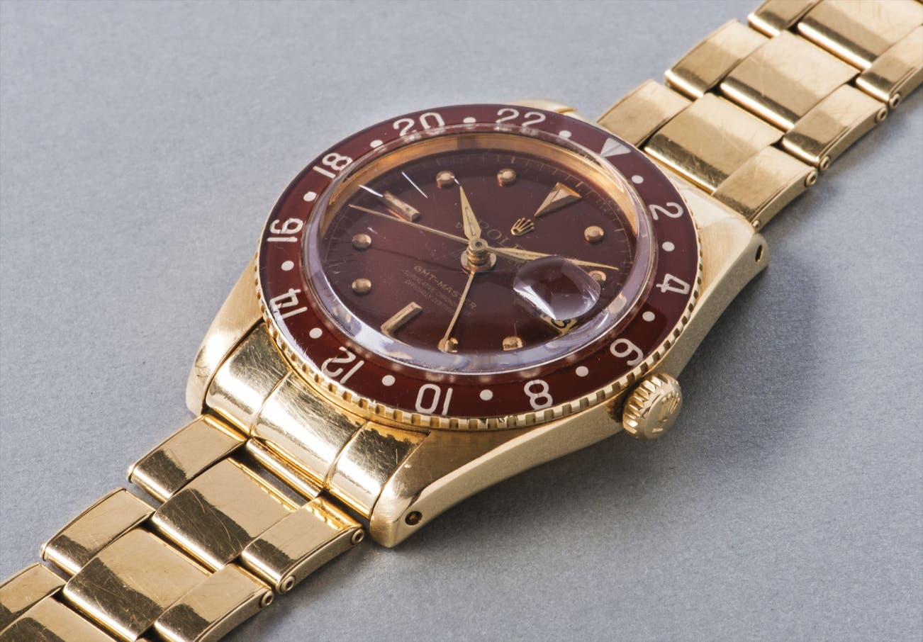 A rare and attractively preserved yellow gold dual time wristwatch with bracelet, brown colored dial and Bakelite bezel