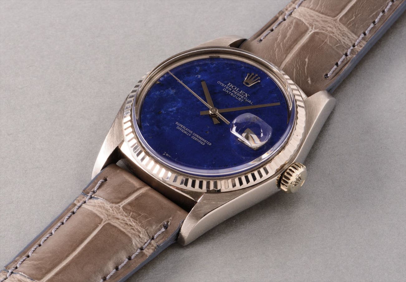 The present reference 1601 from the early 1990s is a lovely example with a rare and unusual combination of a white gold case and lapis lazuli dial. Far from 1970s and 80s diamond-set timepieces with lapis lazuli dials seen in yellow gold, the present watch exhibits a masculine and sophisticated feel. This rare and elegant configuration, combined with its superb condition, will appeal to the most distinguished collector.