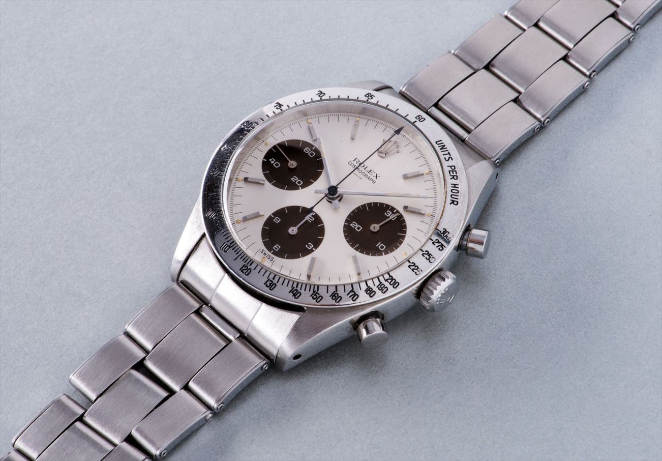 The present lot is not only in absolutely exceptional condition but its dial makes it an absolutely desirable example for the Daytona aficionado. First, it’s fitted with the highly coveted "double Swiss" dial, meaning the country of origin designation is printed twice on the dial. The earliest versions of the reference 6239 exhibit such a configuration, since Rolex used dial stamps made for previous chronograph models as it began the production of the Daytona. Since the Daytona’s bezel was larger than previous models, and therefore covered a larger portion of the dial, Rolex had to stamp the dial again with an inner SWISS to ensure visibility. Secondly, the present lot is marked with a short line right below the ROLEX COSMOGRAPH designation - thus the "6239 underlined" nickname used among the collectors community. While Rolex has never confirmed the meaning, scholars agree this underline indicated that the radioactive radium previously used for the luminous indexes was replaced with a new, safer material - tritium, to be compliant with new government regulations.