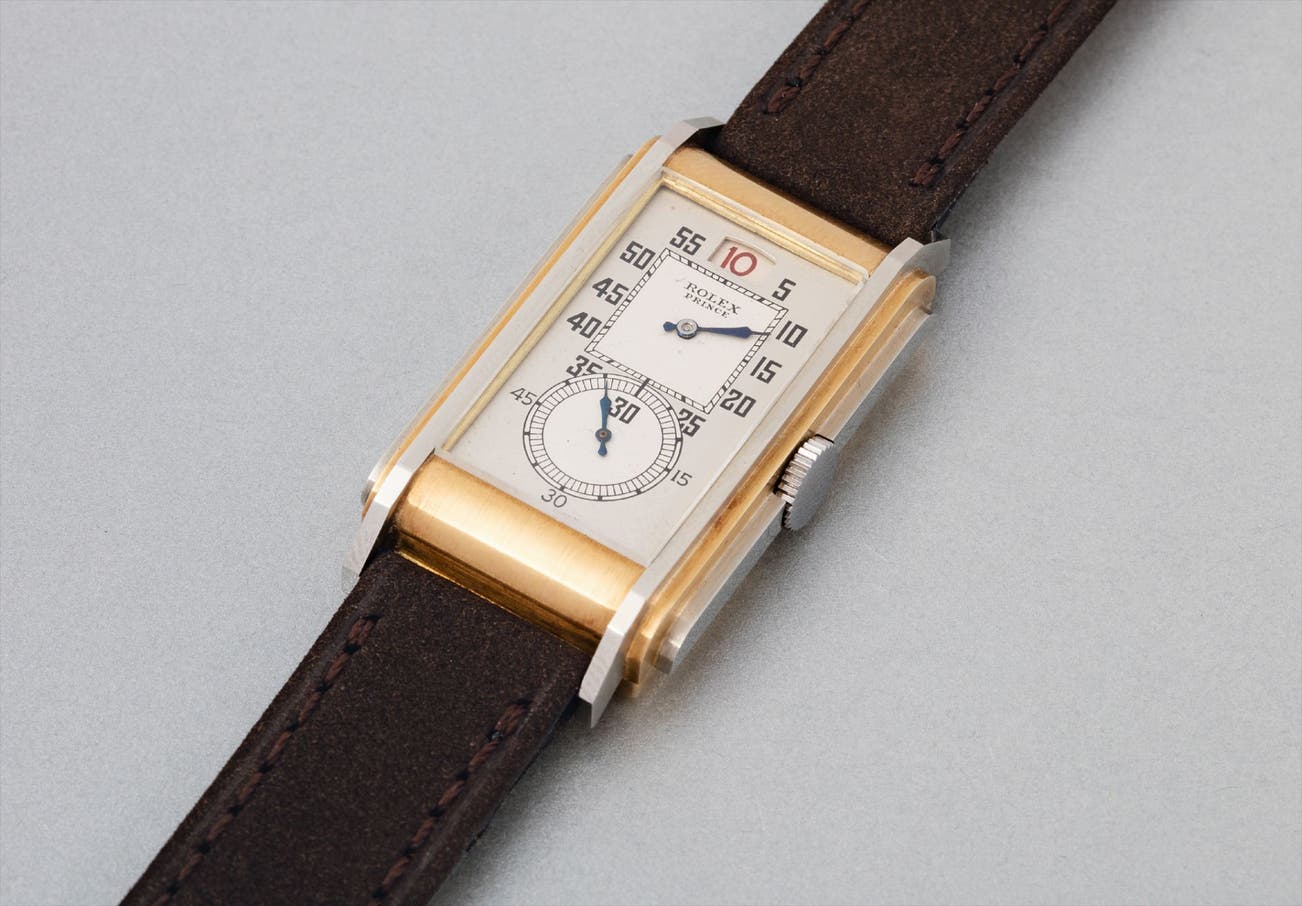From the geometric, art-deco shapes of the yellow and white gold case that evoke the architecture of New York’s skyscrapers to its immaculate two-tone dial with stylized numerals and the shape of the sub dials, the watch perfectly exemplifies Rolex’s mastery of design. Sold in Great Britain, this watch displays perfectly crisp hallmarks. The caseback retains the Glasgow mark of opposed ‘F’s along with a framed ‘K’ corresponding to the years 1933-1934. Hallmarks are even found on the fixed gold spring bars, each stamped with London hallmarks. The rarity and beauty of this oversized piece, combined with its incredible condition make this reference 1587 a must have for the savvy collector.