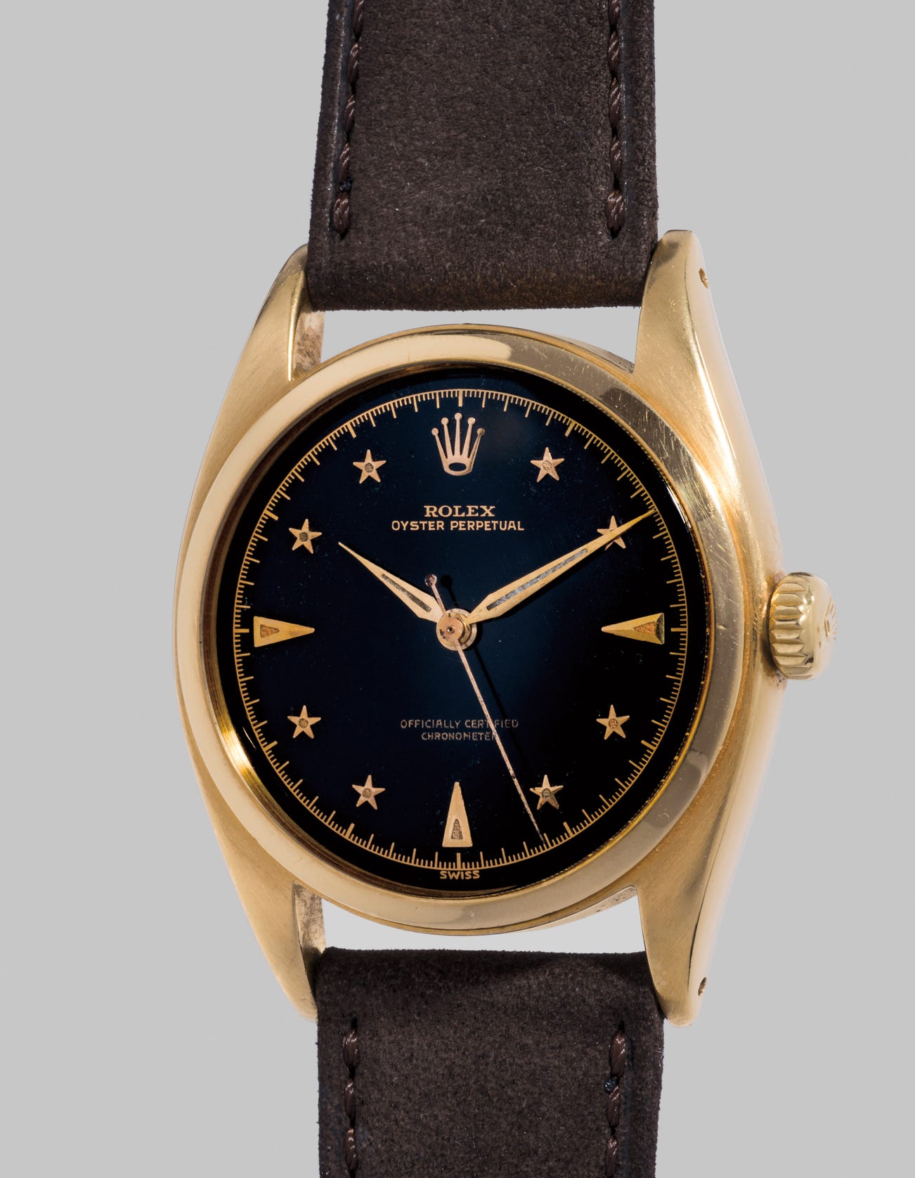 Among those produced, one of the most exclusive and desirable variants of the time-only wristwatch featured a black lacquer dial with eight faceted stars in lieu of numerals, such as the present watch. Also known as the "Galaxy" from advertising of the period, it was acquired by the current owner at auction five years ago, fetching a price of 391,709 Swiss Francs - a new record for a time-only lacquer dial Rolex wristwatch. This record was only recently broken, a similar watch featuring star-set numerals having been sold at Phillips Geneva Watch Auction: TWO for a staggering 425,000 CHF.