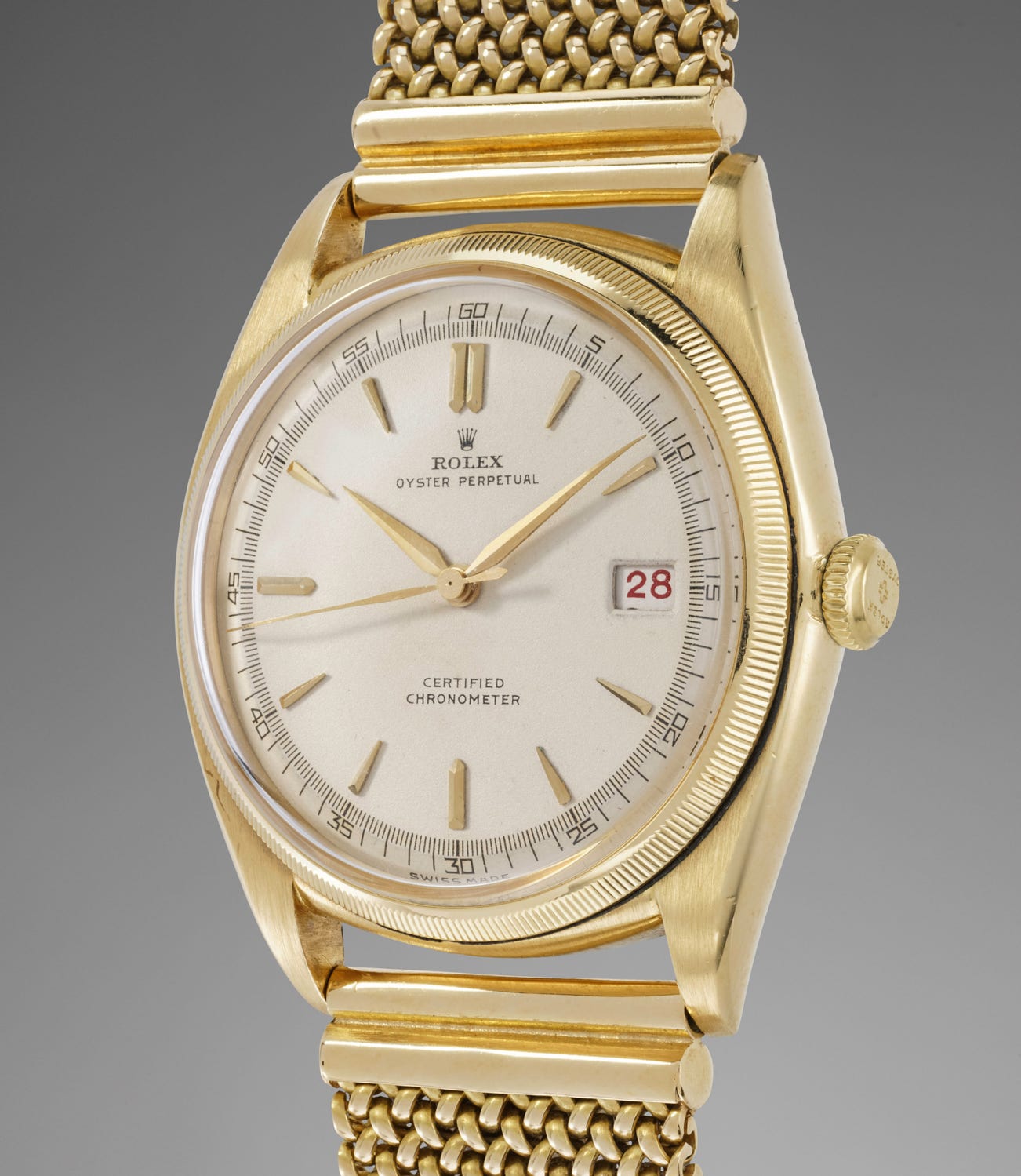 This particular example has been preserved in excellent condition, featuring an eggshell-colored dial displaying an even and beautiful patina. It also features its original Rolex Oyster crown with a brevet cross in the center. Furthermore, the watch retains its roulette red and black date wheel and thin reeded bezel. It would only be later that Rolex produced the fluted bezel that is associated with today's modern Datejust.