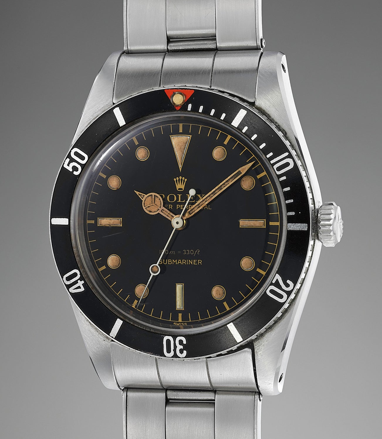 Reference 5508 was manufactured between 1958 and 1962. This Submariner model, nicknamed “small crown” is the last one to carry a 100m depth rating and no crown guards. The present example is presented in an impressively preserved condition. It seems that the watch has spent its life securely stored away from the ocean and worn less than occasionally. The case is as crisp as it was when it left the factory and the fragile bevels that run along the lugs are crisp and sharp. Fitted with a black glossy dial with gilt printings, the watch also displays a perfectly preserved bezel with red triangle and original pearl. It further impresses with a wonderfully firm and tight expandable riveted Oyster bracelet stamped 1.58.