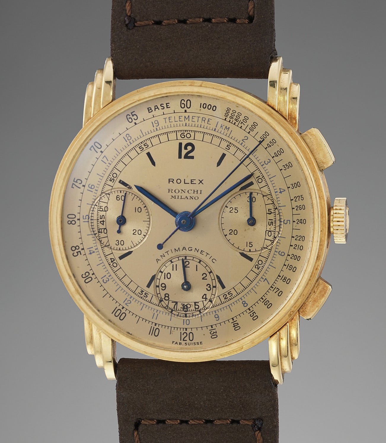 A very rare and fine yellow gold chronograph wristwatch with champagne dial and triple stepped lugs retailed by Ronchi, Milano