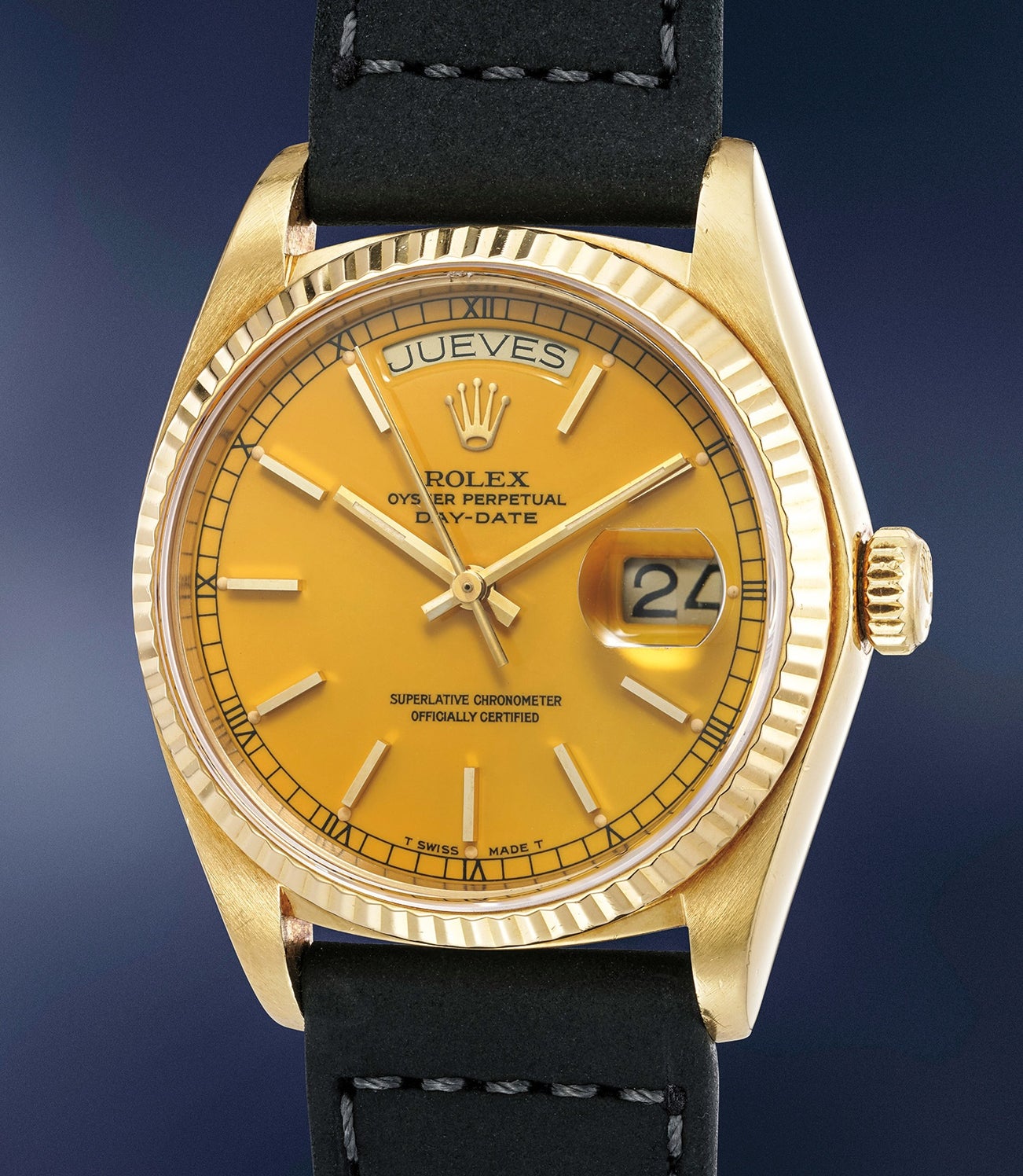 Of all Day-Dates, one of the most exclusive, desirable and distinguished variant is without a doubt, the Day-Date with yellow "Stella" dial. So rare is this model that the market has only seen a handful of examples over the years. When one does show up at auction, it is an incredibly noteworthy occasion.