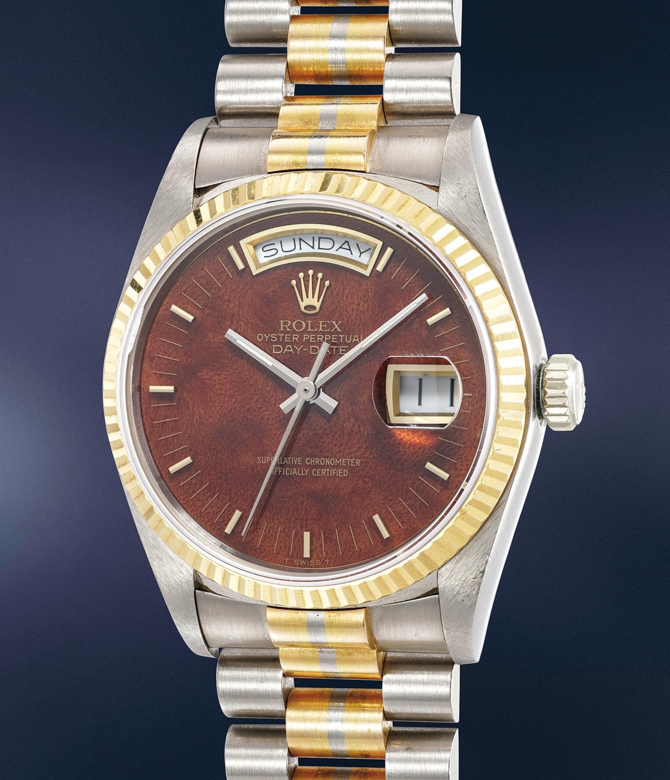 This wonderfully preserved Day-Date features a beautiful briar root wood dial. Given that the wood is a natural material, no two wood dials are exactly the same in appearance making each example virtually unique.