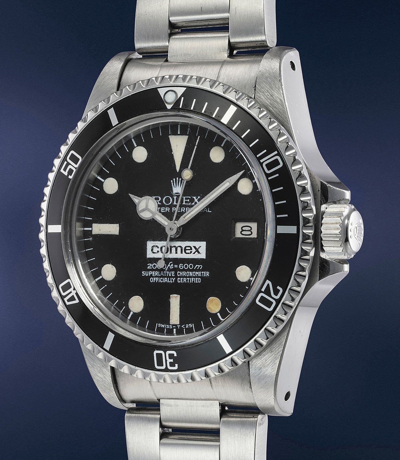 The working counterpart to the diver's later presentation watch, this example was on the wrist of rescue diver Joe Puttnam during the Stena Seaspread accident in 1981. Although heavily relied upon and regularly serviced with Rolex, the watch retains its original ‘600m’ COMEX dial and prominently engraved case back with the issue number 2224, although the mid-case, bracelet, bezel and insert are service items. Presented with a COMEX sticker and photograph of Mr Puttnam, wearing the watch and a copy of "The Professional Diver's handbook".