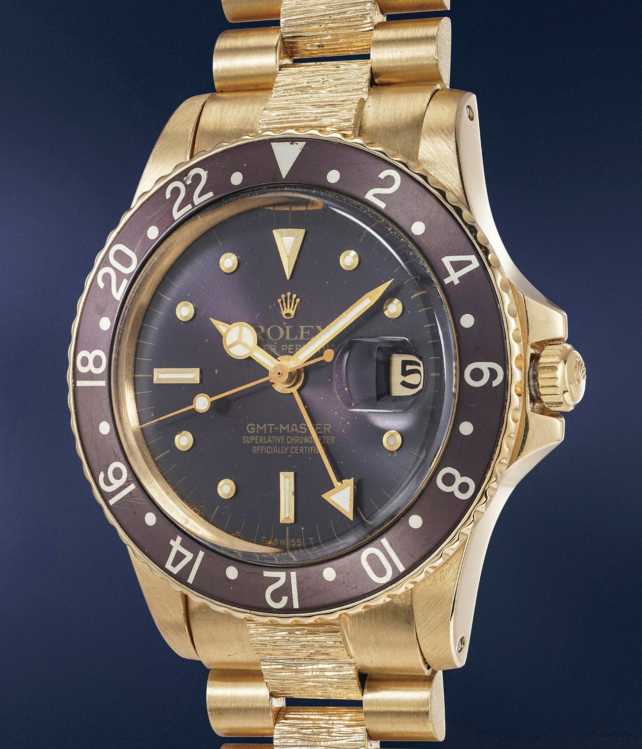 The present watch is without a doubt one of the most striking examples of this restricted gold production to ever resurface. It is well known that sometimes the paint used on watch dials changes color over time, giving rise to what is today known as a “tropical” dial. Brown tropical dials are well known from Rolex to appear on Daytona timepieces, with hues ranging from dark chocolate to terra di siena bruciata. On gold GMTs, some dials are known to sport a similar effect, with areas turning violet. The present example, however, sports an incredible even, dial-wide, iridescent purple/indigo/violet color - ranking this watch as one of the most appealing and collectible tropical gold 1675 to ever appear on the market.