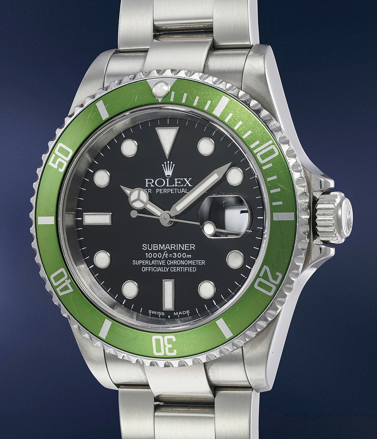This model became an instant favorite amongst collectors and the earliest versions of the “Kermit”, like the present wristwatch, became known as the “Flat 4” due to the flat top of the “40” numeral of the bezel. Models with this font were produced for about just one year before Rolex switched to a different font as well as a slightly different color for the bezel, making these earlier examples highly sought after.