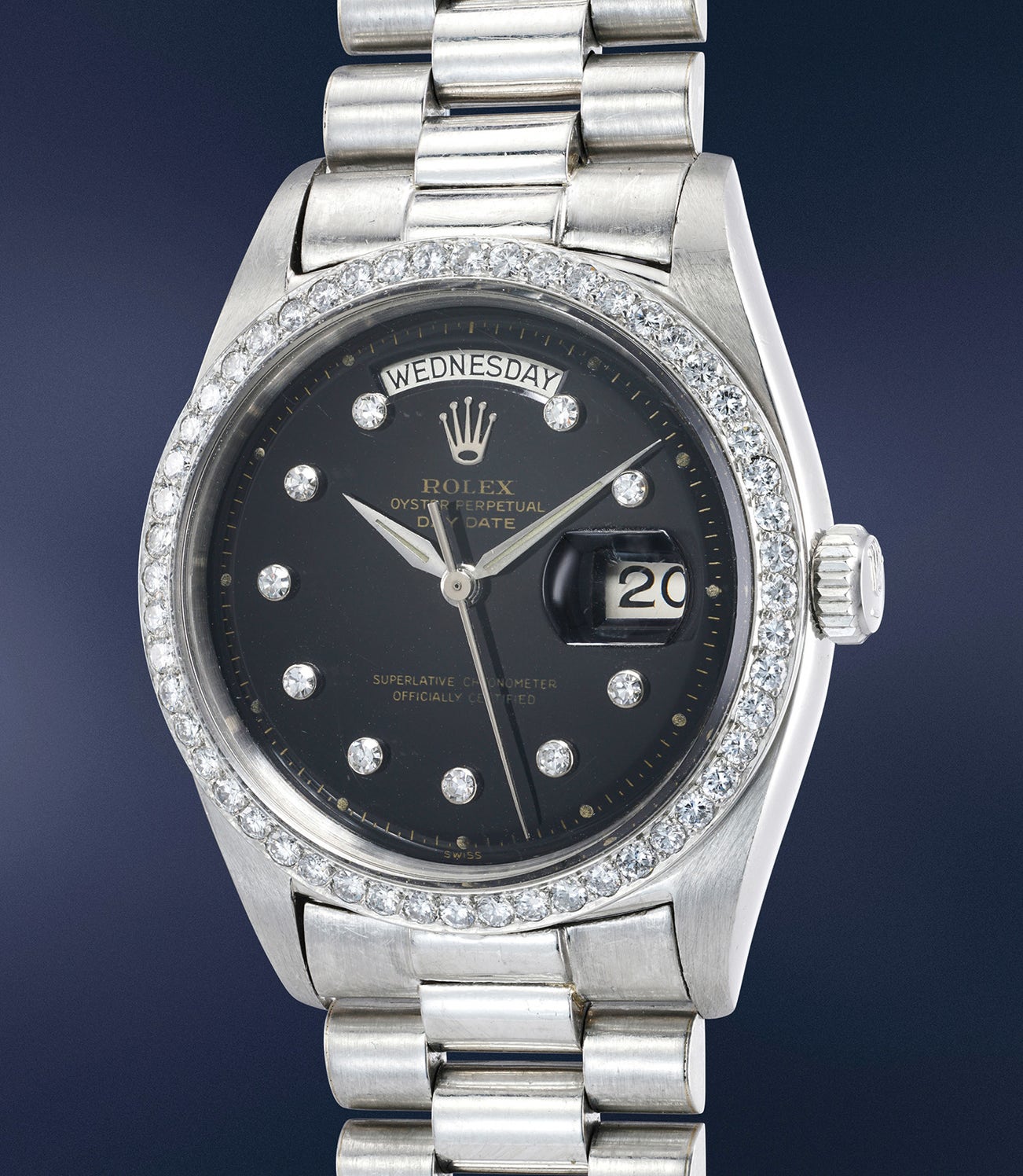 This makes perfect sense when considering the extremely scarce production of reference 6613, of which another example is known from John Goldberger’s book “100 Superlative Rolex Watches”, and a third one from the Hong Kong Phillips sale of May 2016, this latter one featuring a bespoke dial. Such scarcity, combined by the fact that the case numbers of these three watches are all in the 4xx’xxx range, indicates that this model was most probably only produced on special order, a theory further supported by the dial of the present watch. It in fact presents some extremely unusual traits which directly challenge the current scholarship on Day-Date. For example, the diamond setting of the indexes has never before seen round chatons as opposed to the conventional square ones. Even the Day Date signature is highly peculiar, lacking the hyphen between the two words. Such a plethora of unusual traits prompted us to send the watch to Rolex Geneva for a mechanical service (of course specifying not to touch case and dial), and the House promptly executed the overhaul, without raising any objection on any details of the watch, thus implying they deem it correct.