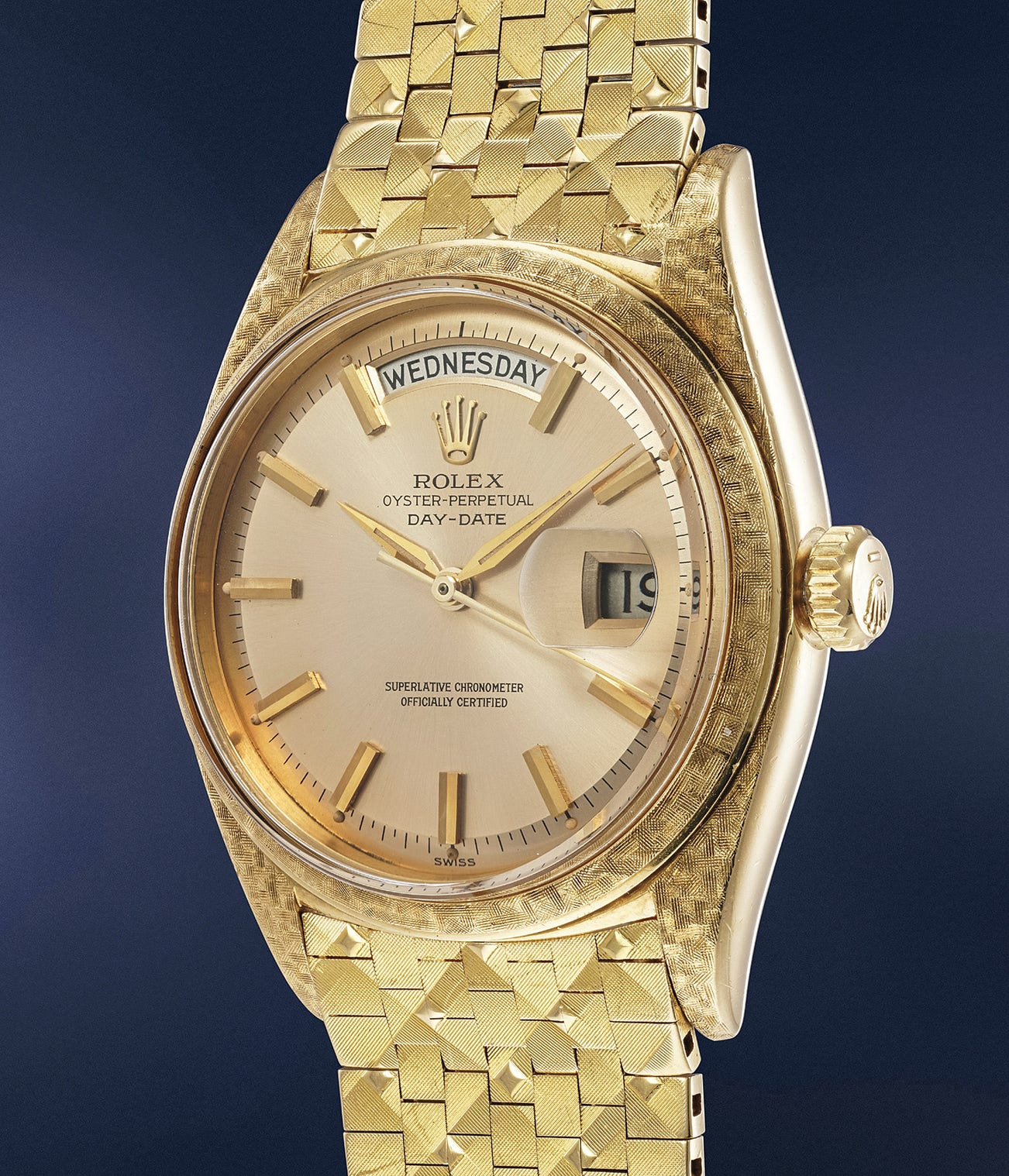 A highly rare and attractive yellow gold calendar wristwatch with center seconds and rare textured bracelet