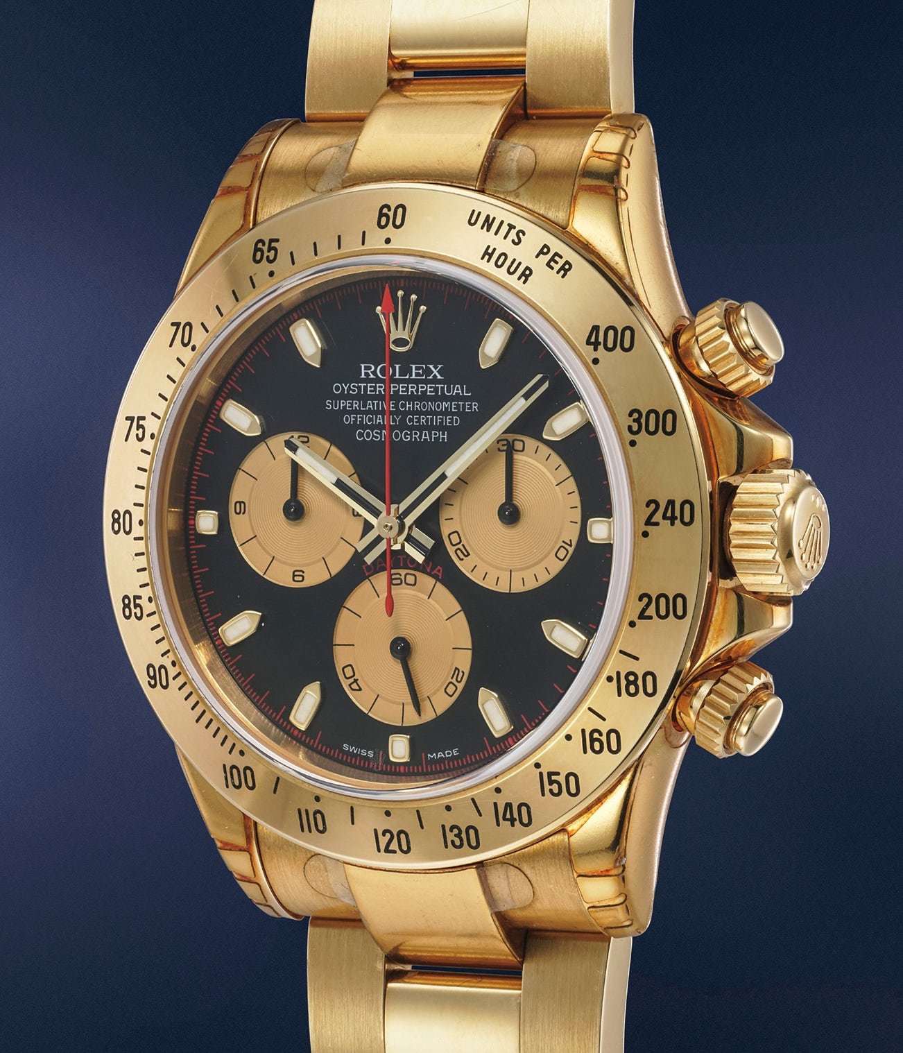 Succeeding to the famed “Zenith” Daytona reference 16528 powered by the robust Zenith El Primero based cal. 4030, the present watch carries much of the same aesthetic as its predecessor. Made of solid 18K yellow gold, the watch stands out by its hefty weight and the warmness of its gold. Although part of the standard design of the Cosmograph Daytona collection, the dial of the reference 116528 has just the right amount of details to raise a smile - in some cases, even accompanied by a awe - on the lips of any discerning watch aficionado. Indeed, its matt black dial with champagne counters is suddenly awaken by a scarlet red chronograph hand and outer divisions. The juxtaposition of colours creates a playful contrast and gives the watch all the magnitude it deserves. Furthermore, it is preserved in excellent condition and the green factory sticker is still present on the case back.
