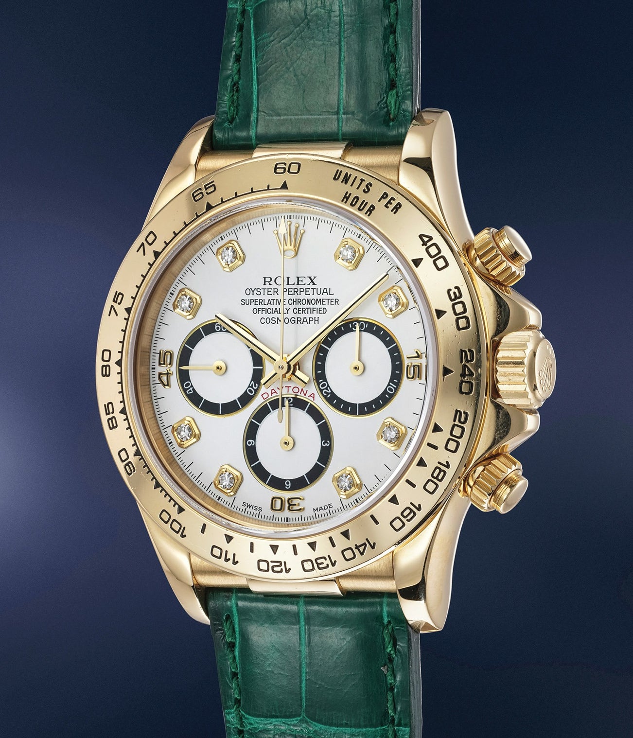 Displaying a striking white dial with diamond-set markers, reference 16518 most notably houses the Zenith-based El Primero movement. Preserved in excellent condition and displaying the original caseback sticker, it is even accompanied by a striking green strap, enhancing the allure of the yellow gold case. Offered without reserve, it provides enormous value and visual satisfaction.
