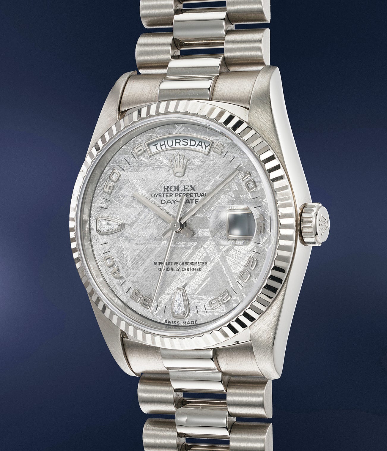 Hardstone dials are among the most attractive and collectible dials to have ever found their way into the Day-Date line. Beyond the present meteorite, other stones have been employed by Rolex: onyx, malachite, marble, agate and jade are just some examples of this remarkable diversity.