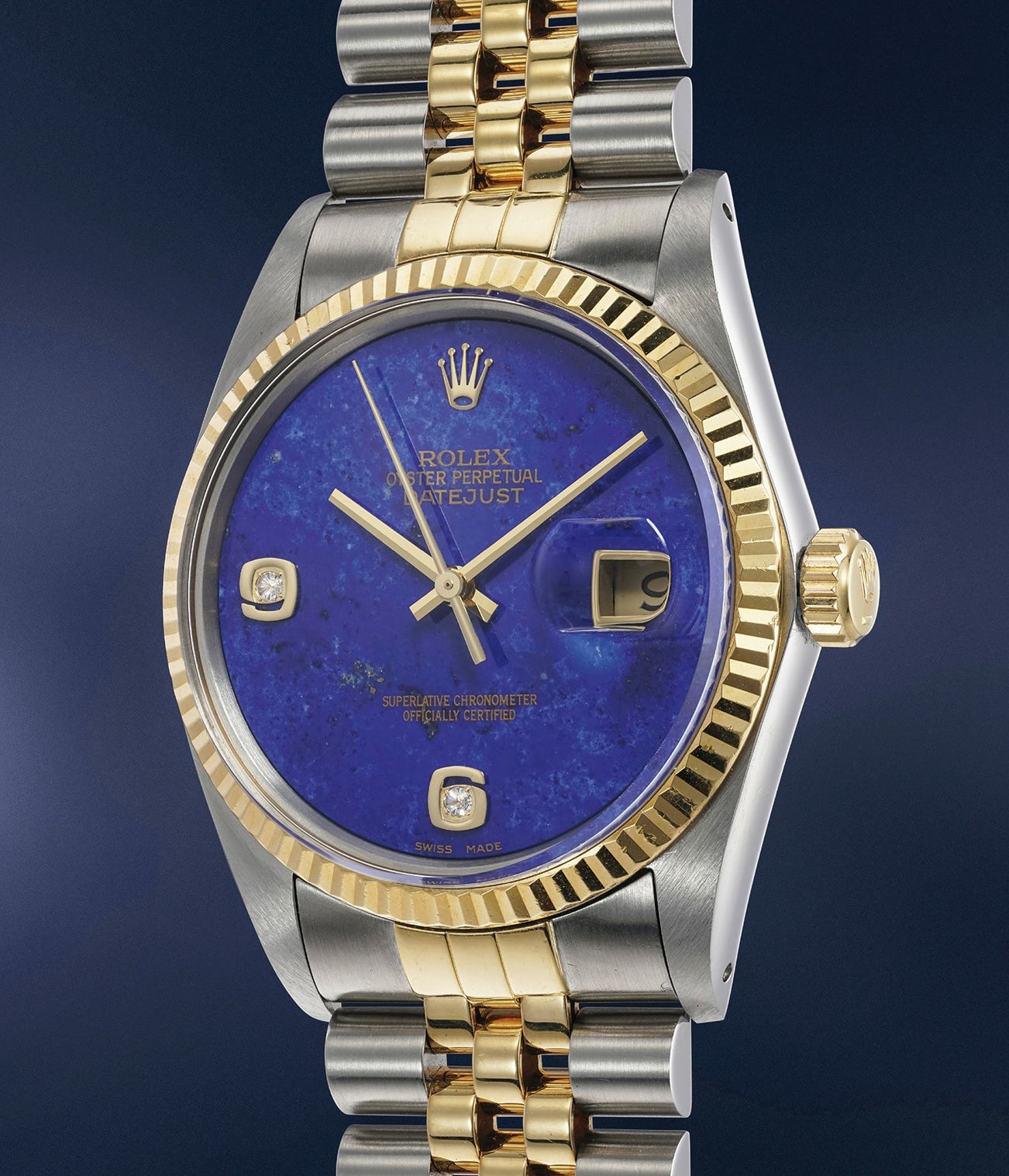 A fine and attractive stainless steel and yellow gold automatic wristwatch with center seconds, date, lapis lazuli and diamond-set dial and bracelet