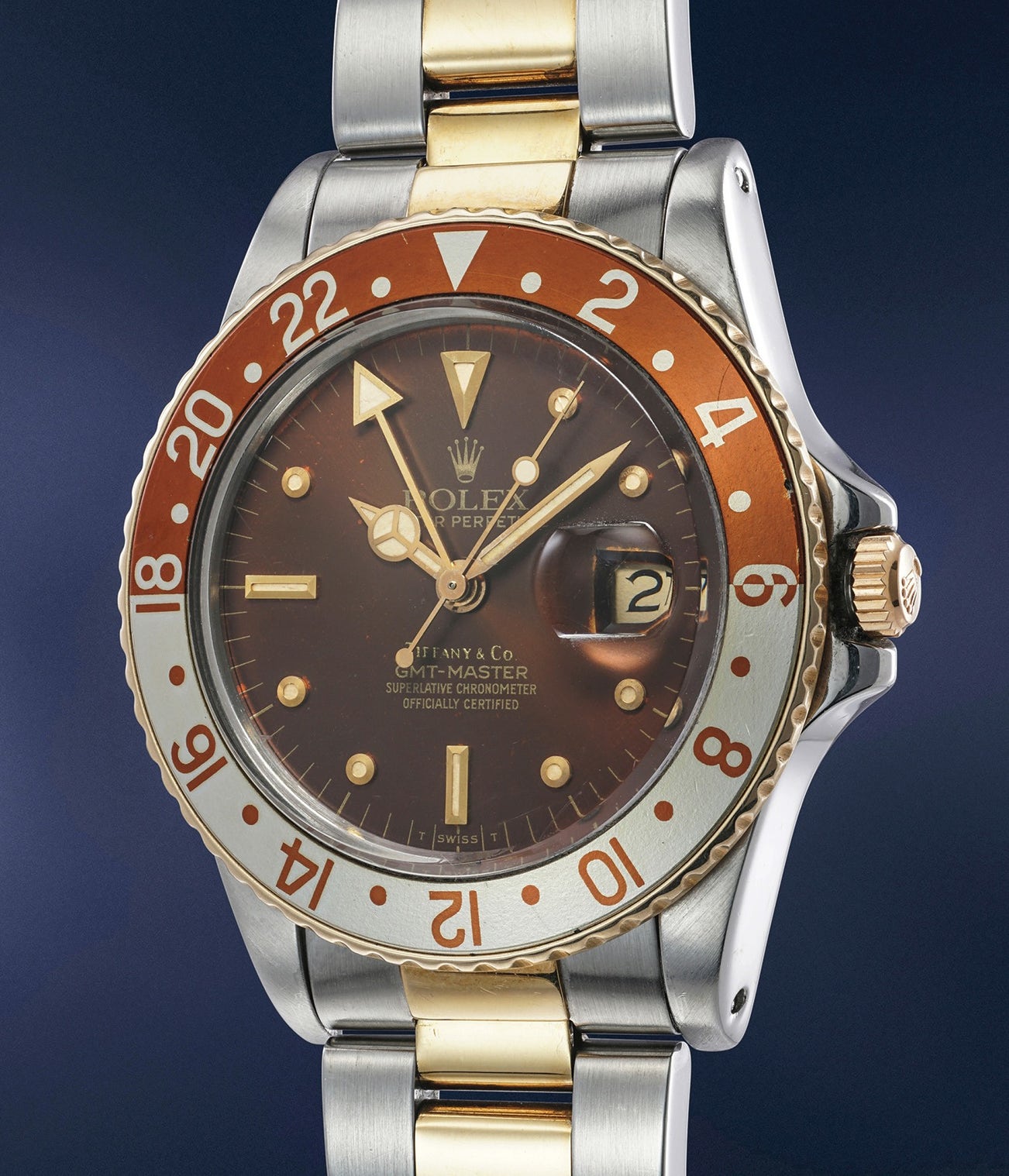 This watch, reference 16753, is a rare variant within the GMT family as it is cased in both stainless steel and yellow gold. It has a beautiful brown dial displaying Tiffany & Co, as well as a caramel and chocolate bezel. Collectors dub this model the 'Root Beer'. The present watch features no 'flaking' to the luminous dots, which is extremely rare, as this particular dial is known easily crack over time. The bezel remains vibrant, displaying a sharp gold and light brown colour, giving the watch a very charismatic look. Moreover, there are traces of a number scratched beneath the lug, consistent with other Tiffany & Co. signed pieces from the era.