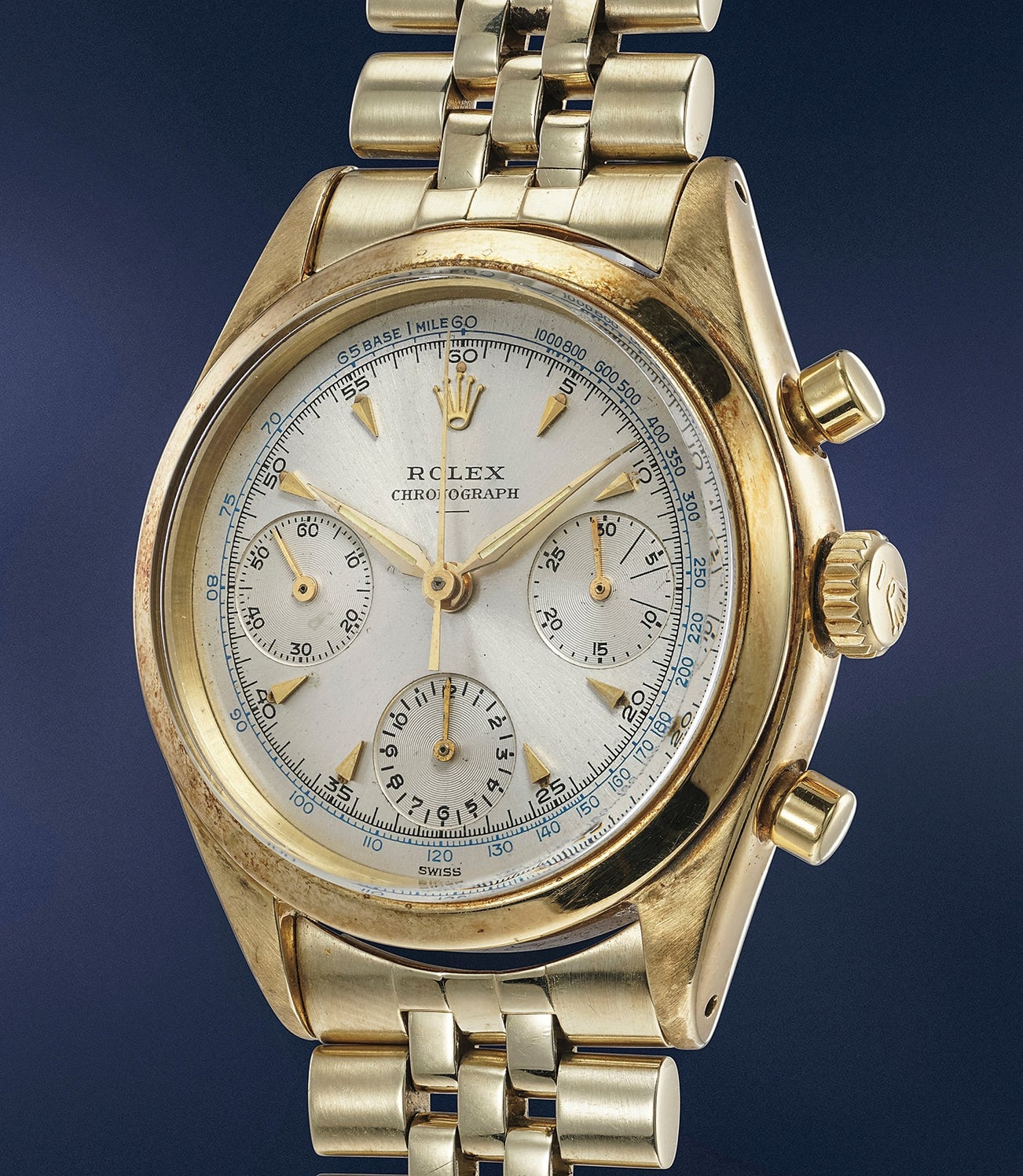 The vibrant, original dial has warmed to a pale champagne hue which matches beautifully with the hue of the case and bracelet, allowing the blue tachymeter scale to pop. It is an exceedingly rare opportunity for the Rolex chronograph aficionado.