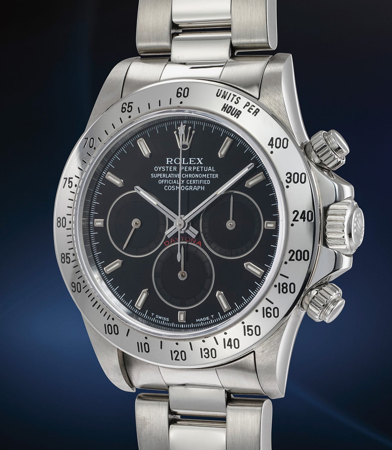 Bearing a “W” serial number from circa 1995, the watch falls into the rare batch of “tropical” dials. Its three registers have turned from a silver colour to an intense dark brown, almost black hue, granting the watch the infamous name of “Darth Vader”. The type of lacquer applied during the manufacturing process has aged over time, and contributed to the unique “tropicalization” of certain S, N, T and W serial Daytonas' subsidiary dials. Extremely rare as these imperfections are natural occurrences, such dark example is extremely desirable and scarce.