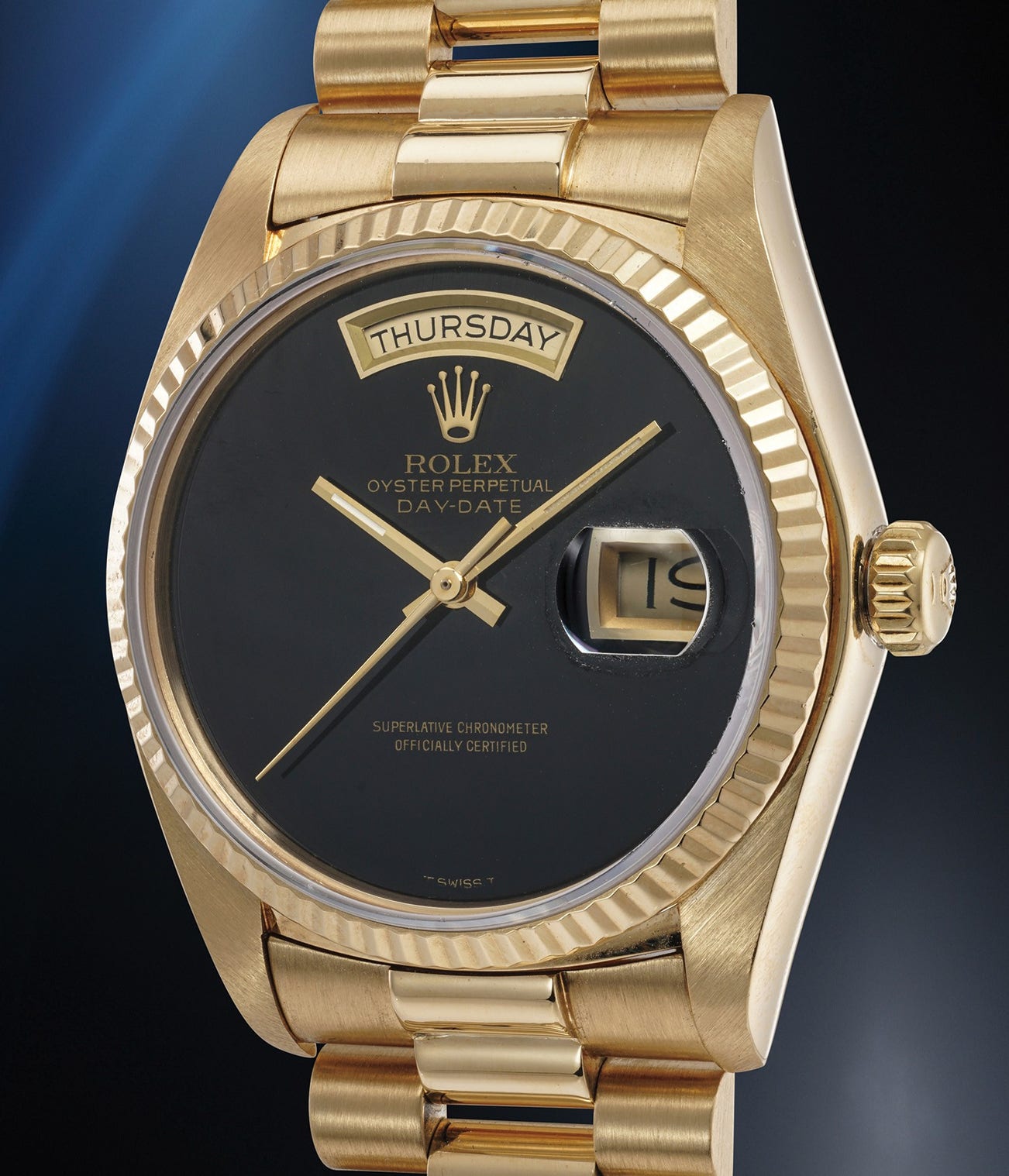A very scarce and highly attractive gold wristwatch with center seconds, day, date, onyx dial and presentation box