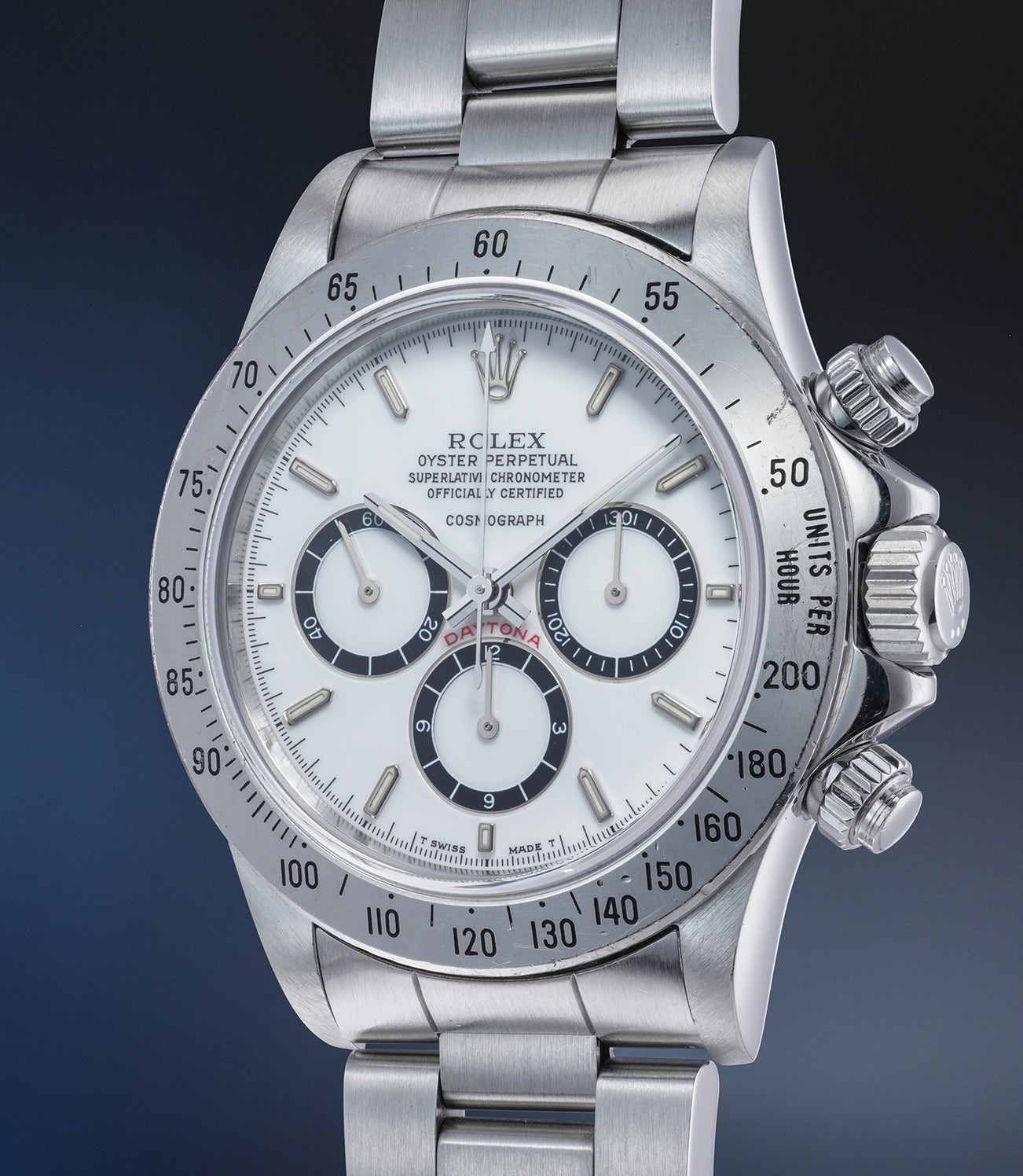 Indeed, while reference 16520’s popularity has increased dramatically in the past years, few automatic Cosmograph Daytonas are as beloved as the first-generation models ‘R Series’. As opposed to later white dial 16520s that feature a more matte appearance, these early examples feature a lacquered, glossy surface, a so-called “porcelain” dial. The black graphics is printed on top of the dial, giving it a three-dimensional effect. Furthermore, the Cosmograph script sets further apart from the first four lines of text, as if floating in the middle of the dial. Of particular note is the “inverted 6” on the 6 o’clock subsidiary register, highly appreciated by collectors today. The reference 16520 was the first Daytona to be fitted with a sapphire crystal, and with a larger case diameter measuring 40 mm, which was equipped with the rare 200 graduation bezel. Later examples would have a bezel calibrated to 400 units.