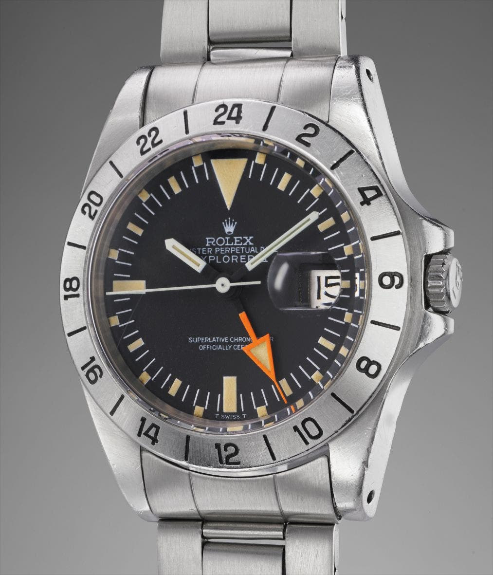 The present watch is fitted with a rare Mk 1 dial, which is correct for the serial range. The dial displays a "T Swiss T" designation underneath 6 o’clock, instead of "T Swiss<25 T", which later generation dials would feature. The numerals have furthermore aged with warm orange patina, which match the hands. The watch features a correct straight seconds hand without the luminous lollipop, which was only fitted to the earliest reference 1655s. It is furthermore accompanied by its original bracelet, stamped for the fourth quarter of 1972.