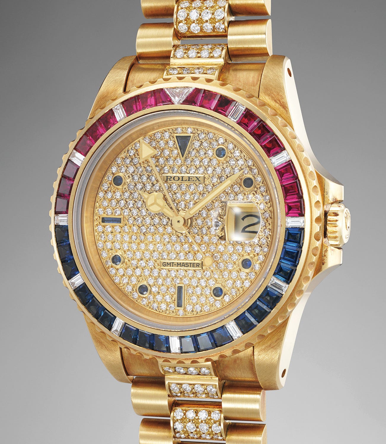 Heavy, robust and lavishly set with diamonds, sapphires and rubies, this variant is nicknamed "SARU", referencing its precious gem-set bezel. The present model, along with reference 6270 and 6269, was the earliest Rolex sports watch to feature precious stones. This concept was incredibly daring in the 1980s, as tool watches and luxury gem-set timepieces resided in two separate spheres.