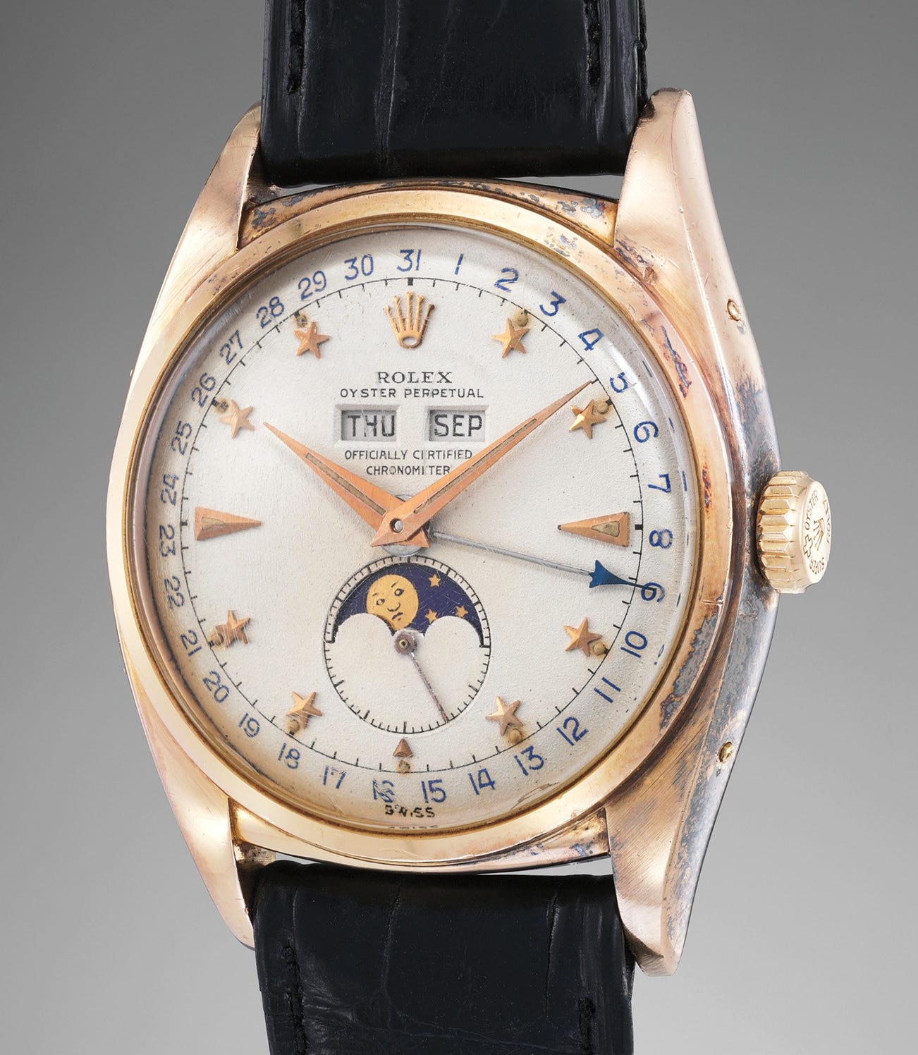 The present version is undoubtedly the rarest and most coveted version cased in pink gold and fitted with eight faceted stars in lieu of hour numerals. Such is the desirability and popularity of the watch, that collectors have dubbed it "Stelline", meaning "starlet" in Italian. Reference 6062 is one of two Rolex models to feature a triple calendar complication with a moon phase complication. While reference 6062 features a screw down Oyster caseback, reference 8171 features a snap-on caseback.