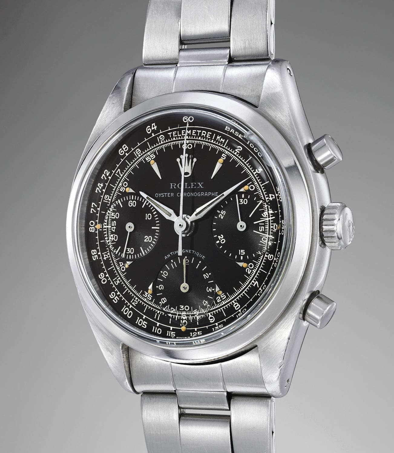 The present lot bewitches the beholder with its exceptionally well-preserved black gloss dial with tachymeter and telemeter scales: while most black gloss vintage Rolex dials tend to age with clouding, bubbling or patina - more or less strong according to conservation history of course - the present one arrives to us in astoundingly flawless condition of all its elements: from the gloss finish, to the scale, to the accents.