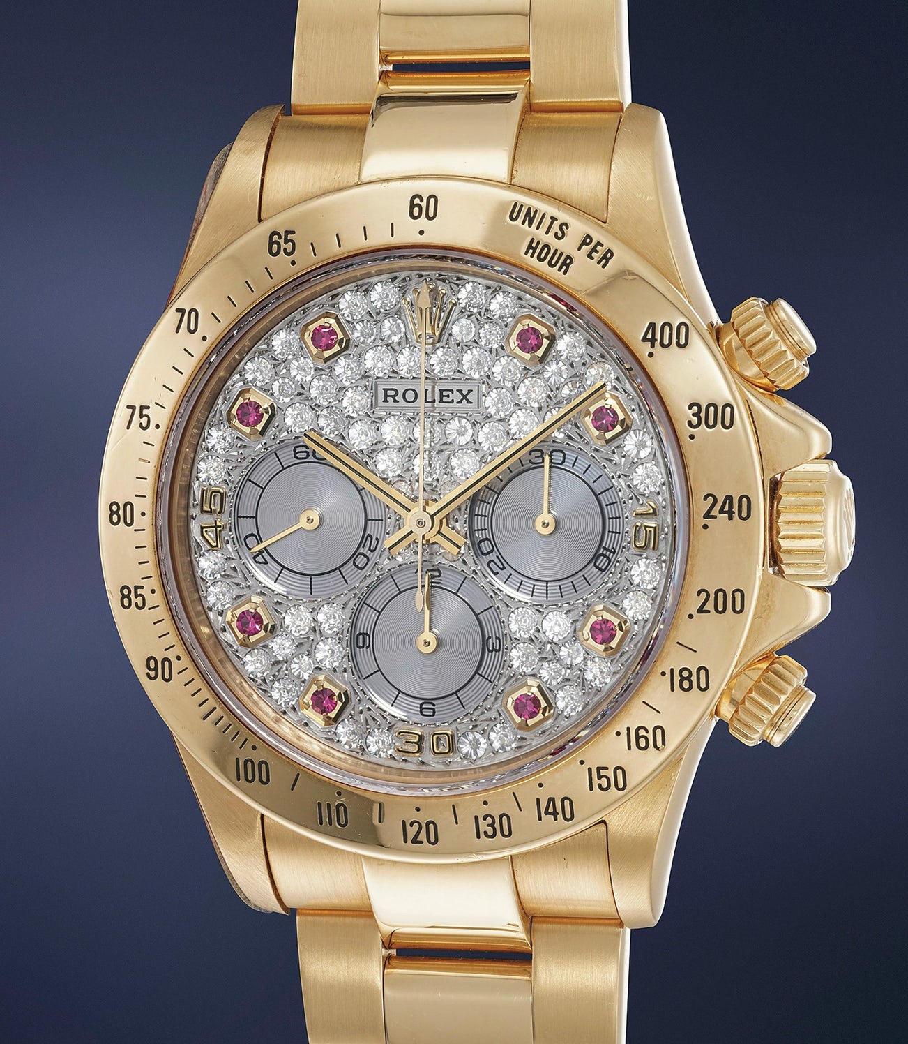 Subsidiary counters, which are usually golden on pavée dials, are in this instance silvered. The reason for this is that the owner of this watch requested and obtained a dial upgrade for his 16528. As it turns out, dials mounted at a later time by Rolex feature silver subdials rather than golden. However, the silver actually gives the dial a more balanced appearance, fitting beautifully with the diamonds with a touch of flamboyance thanks to the red of the rubies.