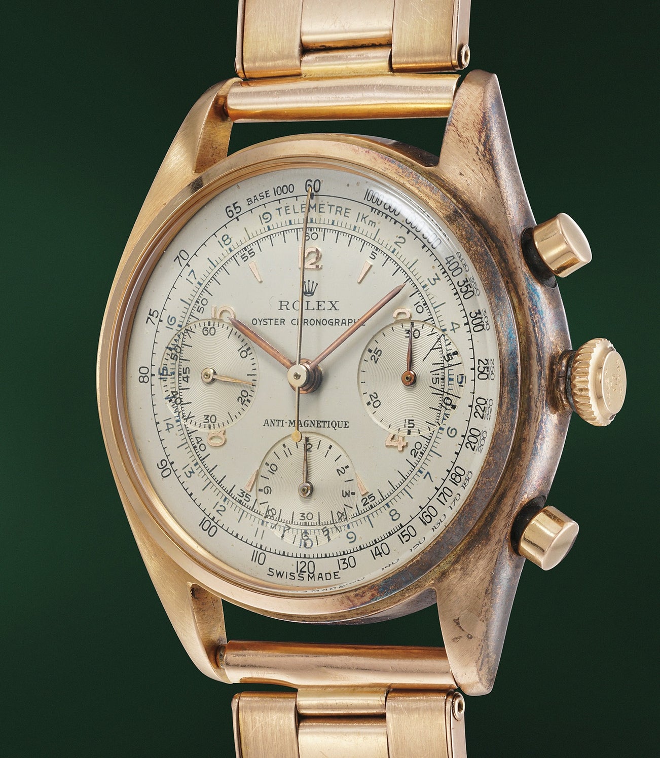 The watch is presented in overall excellent condition, the black telemeter and tachymeter scales are epitomes of readability thanks to the elegant contrast with the silvered dial. The subtle ivory patina - which amplifies the vintage appeal of the watch - is a further testament to the unrestored condition of the dial. The yellow gold hands and yellow gold Arabic numbers add the final dash of flamboyance to the overall look of the watch. The light oxidation on the right side of the case is indication of a life mostly spent in the safety of a vault, an unsurprising situation given the overall condition of the case which arrives to us extremely well preserved. The rarity and importance of this model, coupled with such lovely conditions, render this find an absolutely exciting proposal, a "must-have" for the most refined collectors of important vintage Rolex timepieces.