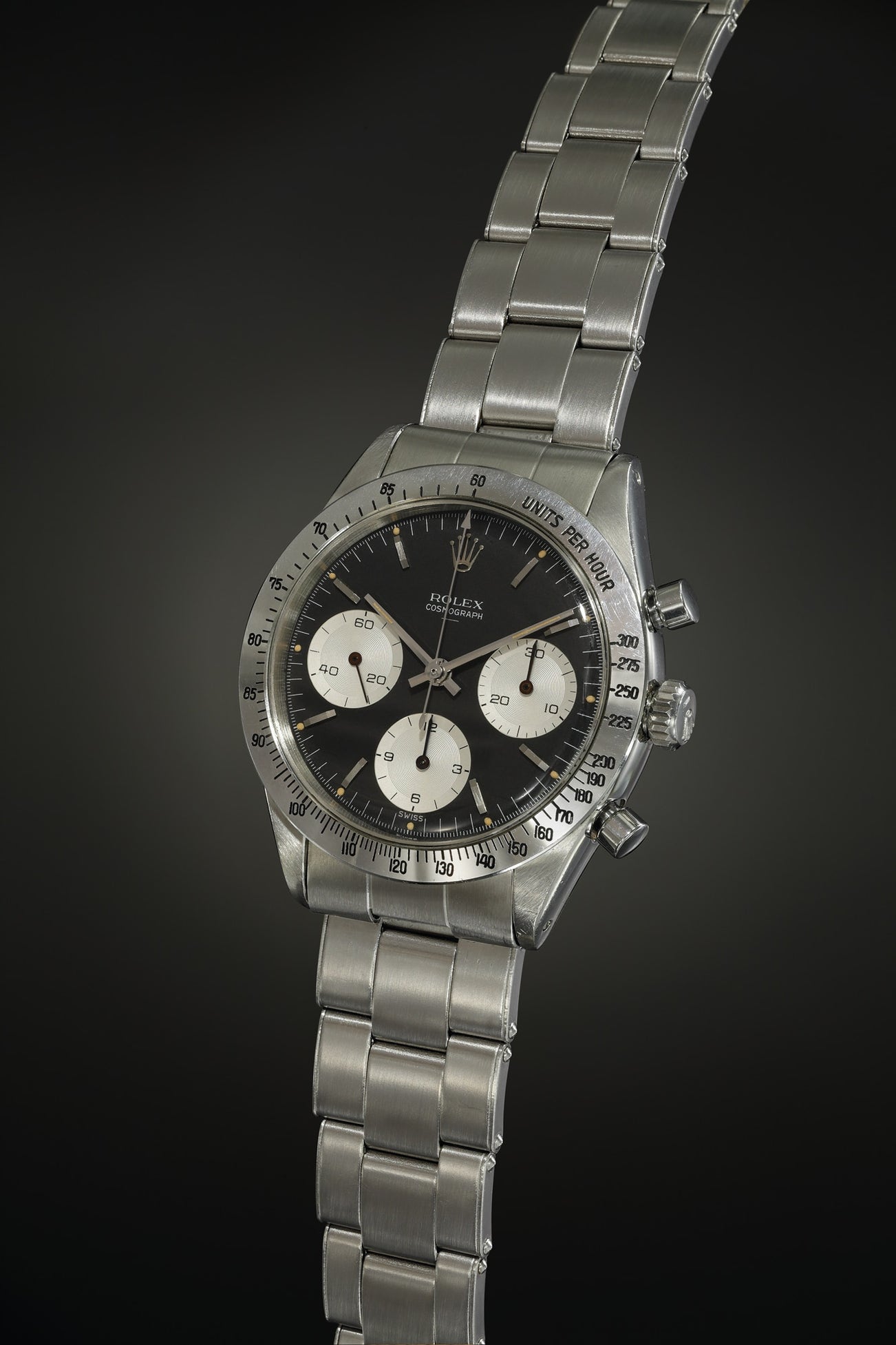 This watch is among the earliest reference 6239s ever produced and displays all the correct attributes of the popular "Double Swiss Underline". The Mk 1 bezel is calibrated to 300 units per hour and features small hash marks. It is also recognizable by the 275 intermediary unit, which cannot be found on later examples. The black "Double Swiss Underline" dial is most compelling. Rolex had originally used dial stamps that were designed for use on previous models. Since the bezel of the new "Cosmograph" was larger and covered the original printing, Rolex redesigned the stamps and printed "Swiss" the second time. Once the dial was fitted, the inscription was immediately visible again.