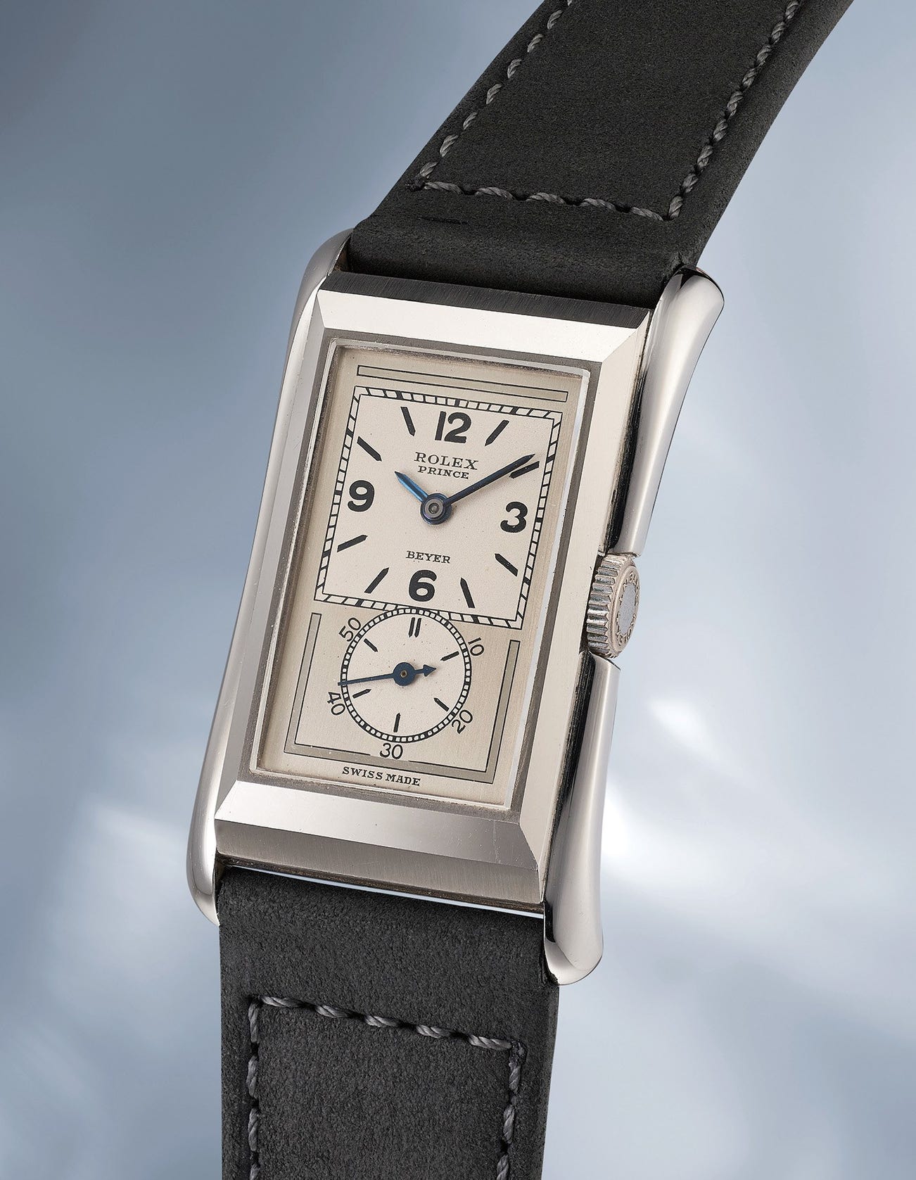 Introduced in 1928, the stylish Art Deco Rolex Prince was advertised as "The Watch for Men of Distinction". The model became known as the doctor’s watch due to the large subsidiary seconds dial, which was ideal for measuring a patient’s pulse rate. The present lot from the 1490 series is distinguished by the flared sides and called "Brancard" (stretcher in French).