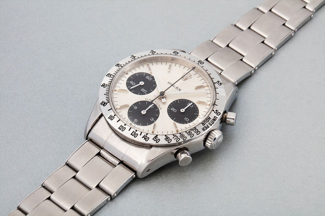 Its desirability is further enhanced by its outstanding condition, with all luminous markers intact, each having aged to pleasing, varying shades of chocolate brown. This watch is, unquestionably, one of the rarest versions of the legendary Daytona. Possessing remarkable elegance, its importance in the field of collectible Rolex watches cannot be overstated. It is a trophy watch worthy of crowning the world’s most important collections of Rolex watches.