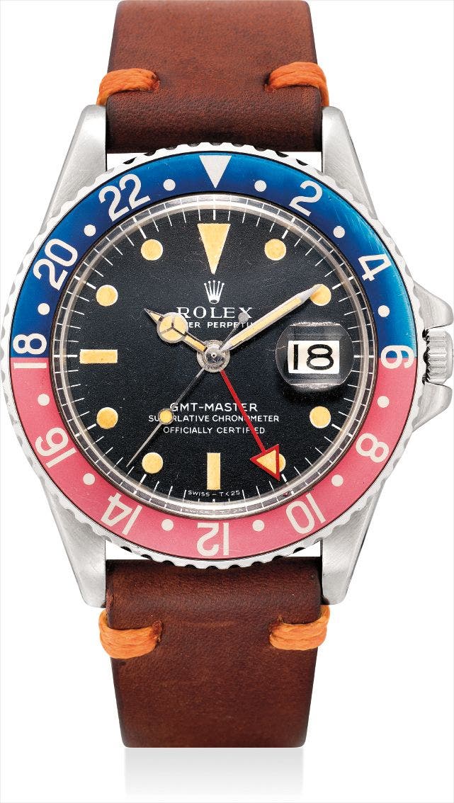 This matte dial reference 1675 with large tipped 24 hour hand has been kept in very good original condition and the numerals and hands have aged consistently. This aging has resulted in a nice warm orange tone. The bezel insert displays a nice pink and blue colouring, further enhancing this watch's appeal.