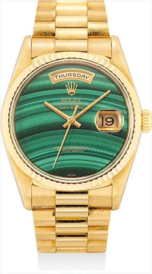 The present Day-Date is fitted with a malachite hard stone dial, due to the fragility of the stone, no hour markers have been fitted to the dial. The graphics are in gold and gold frames surrounded the calendar apertures, like with all Rolex hard stone Day-Dates.