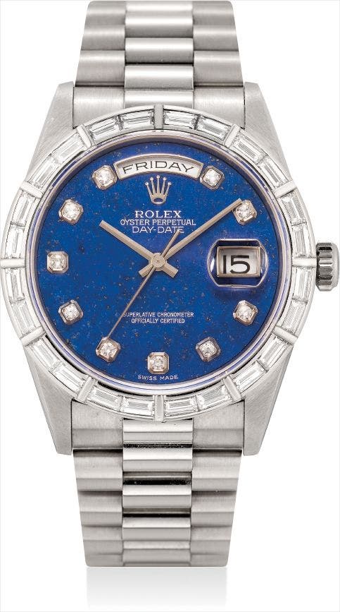A very fine and rare white gold and diamond-set calendar wristwatch with sweep centre seconds, lapis lazuli hardstone dial, bracelet, guarantee and fitted presentation box