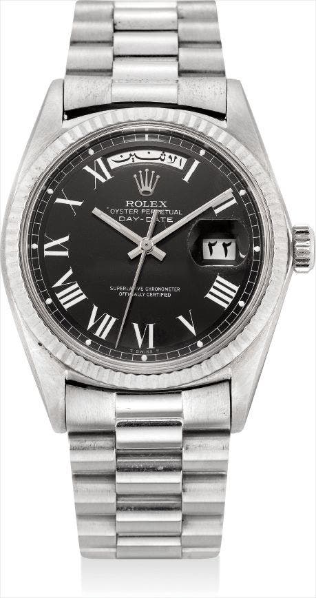 A very fine and very rare white gold Arabic calendar wristwatch with sweep centre seconds and bracelet