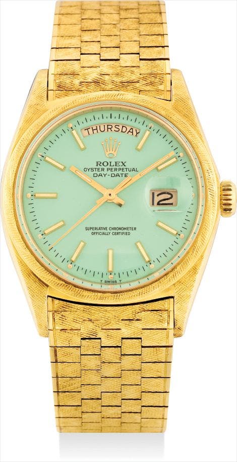 A fine and very rare yellow gold calendar wristwatch with sweep centre seconds, pistachio "Stella" dial and rare textured bracelet