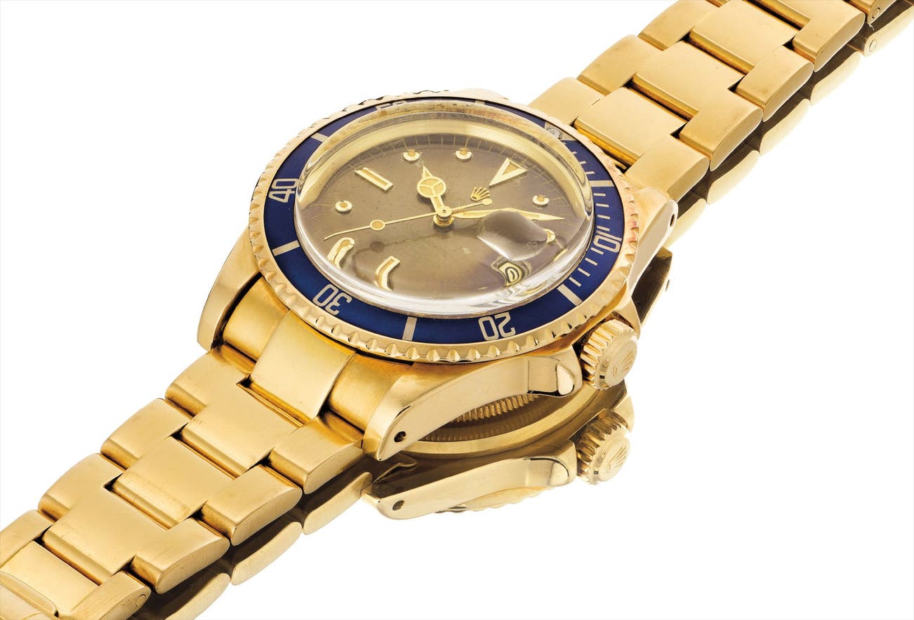 A fine and rare yellow gold wristwatch with sweep centre seconds, "tropical" dial and bracelet