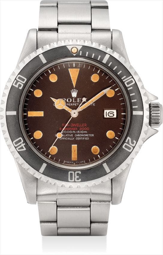 The present example is fitted with the Mark II dial, which was in production from 1967 to 1970. The Seadweller, Submariner 2000, is printed in red directly onto the dial and is typically a very vibrant red colour. The coronet spikes on the Mark II dial are usually distorted looking and the oval at the base of the coronet is very small and difficult to see. This particular Mark II dial features a "tropical" dial aged to a beautiful and uniform shade of chocolate brown. The luminous hour markers, perfectly matching its luminous hands have similarly aged to a beautiful warm orange.
