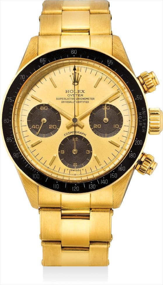 Reference 6263 was manufactured for nearly 20 years with an estimated 2000 pieces made in gold, the majority bearing COSC Certified Chronometer designation on the dial. The present watch is fitted with a champagne dial and black subsidiary registers. The bezel is extremely well preserved with no chips or losses to its calibrations.