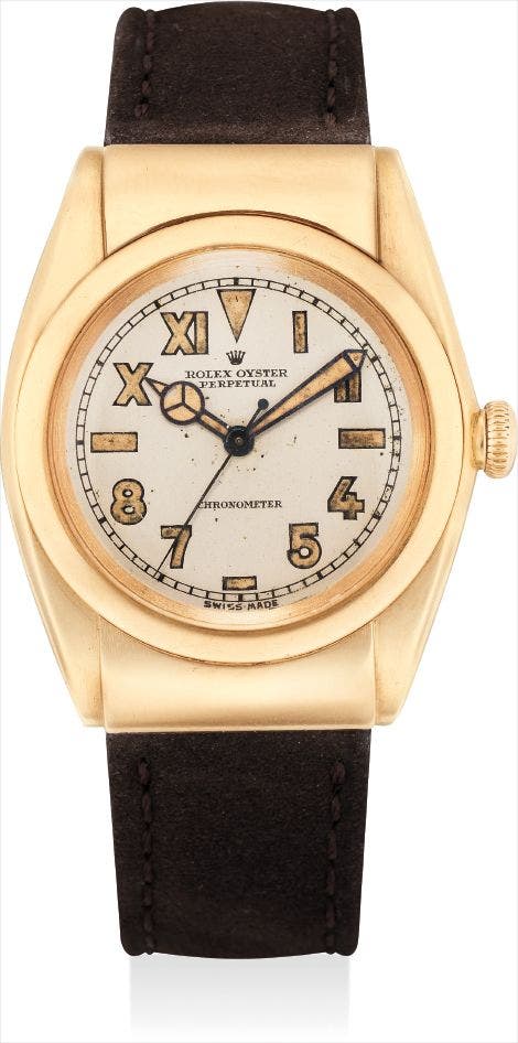 A fine and very rare pink gold wristwatch with sweep centre seconds, hooded lugs and California dial