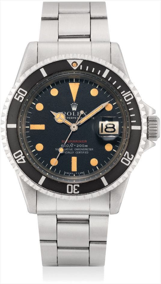 This 1680 red Submariner is in incredible condition still retaining all of its original accessories from the point of sale. The case has never been polished and carries extremely sharp beveled edges and crisp reference and case numbers. The bezel still carries its original luminous dot at 12 o'clock. The dial is incredibly charismatic with beautifully aged lumes, which has aged consistently with the Mercedes hand forming a wonderfully warm orange tone. The bracelet is original to the watch and is in very appealing original condition.