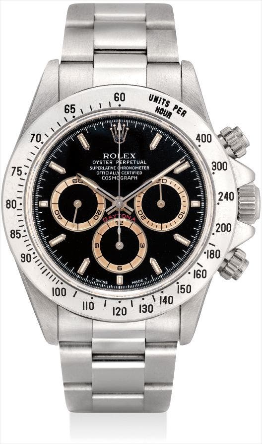 This natural oxidation process affects automatic Daytonas manufactured from 1993 to 1997. The current watch falls into the last year of these "tropical" examples. The present watch is in immaculate condition, with full proportions, finishes and original green factory sticker to the case back.