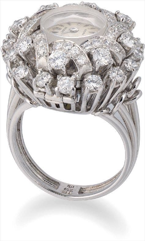 This expertly crafted and beautiful diamond ring watch is in fabulous condition and still retains its green factory sticker and original fitted presentation box. Set with over 3 carats of diamonds, the watch is hinged into the ring and the wearer simply lifts the central part in order to wind it. Another example cannot be found anywhere in literature and it is potentially unique.
