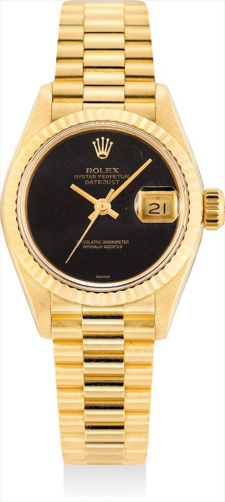 A lady's rare yellow gold wristwatch with sweep centre seconds, date, onyx dial and bracelet