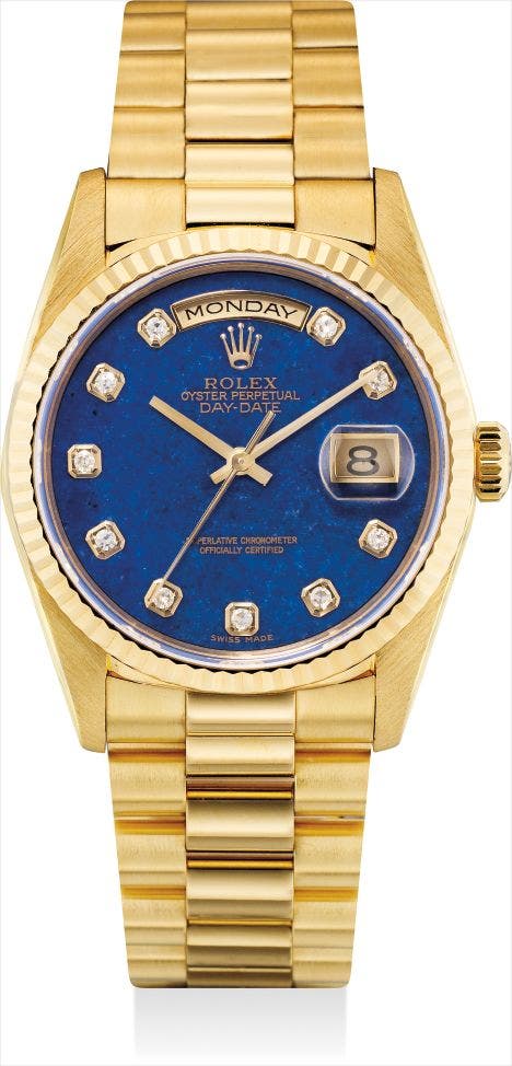 A fine and very rare yellow gold and diamond-set calendar wristwatch with sweep centre seconds, lapis lazuli hardstone dial and bracelet