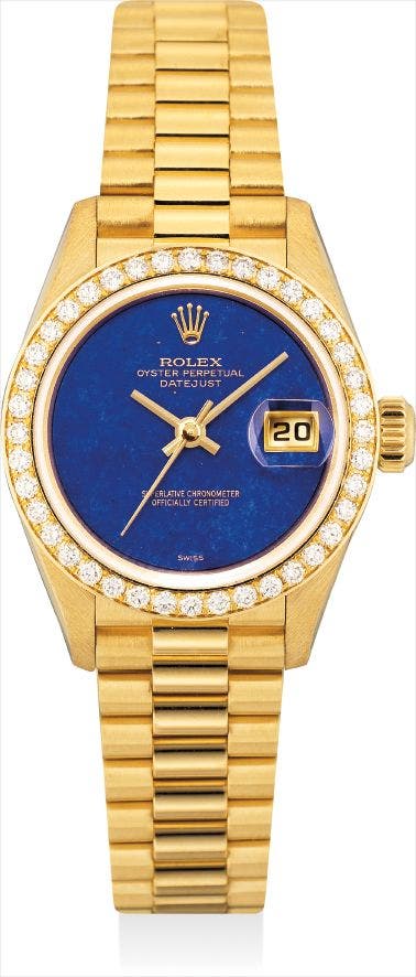 A lady's very rare yellow gold and diamond-set wristwatch with sweep centre seconds, date, lapis lazuli hardstone dial and bracelet