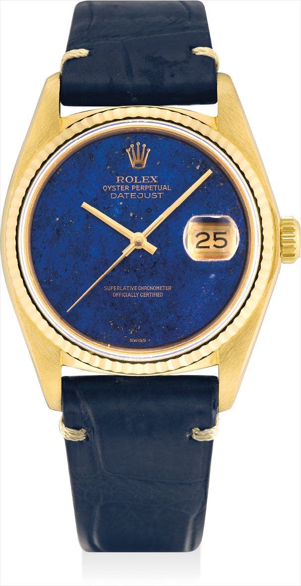 A rare yellow gold calendar wristwatch with sweep centre seconds and lapis lazuli hardstone dial